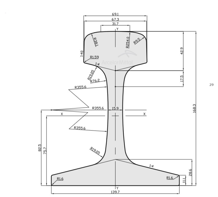 Rail profile 115RE R10 (TR57) manufactured according American Standard AREMA, mass 56,90 kg per meter, equivalent 115 pounds/yard.